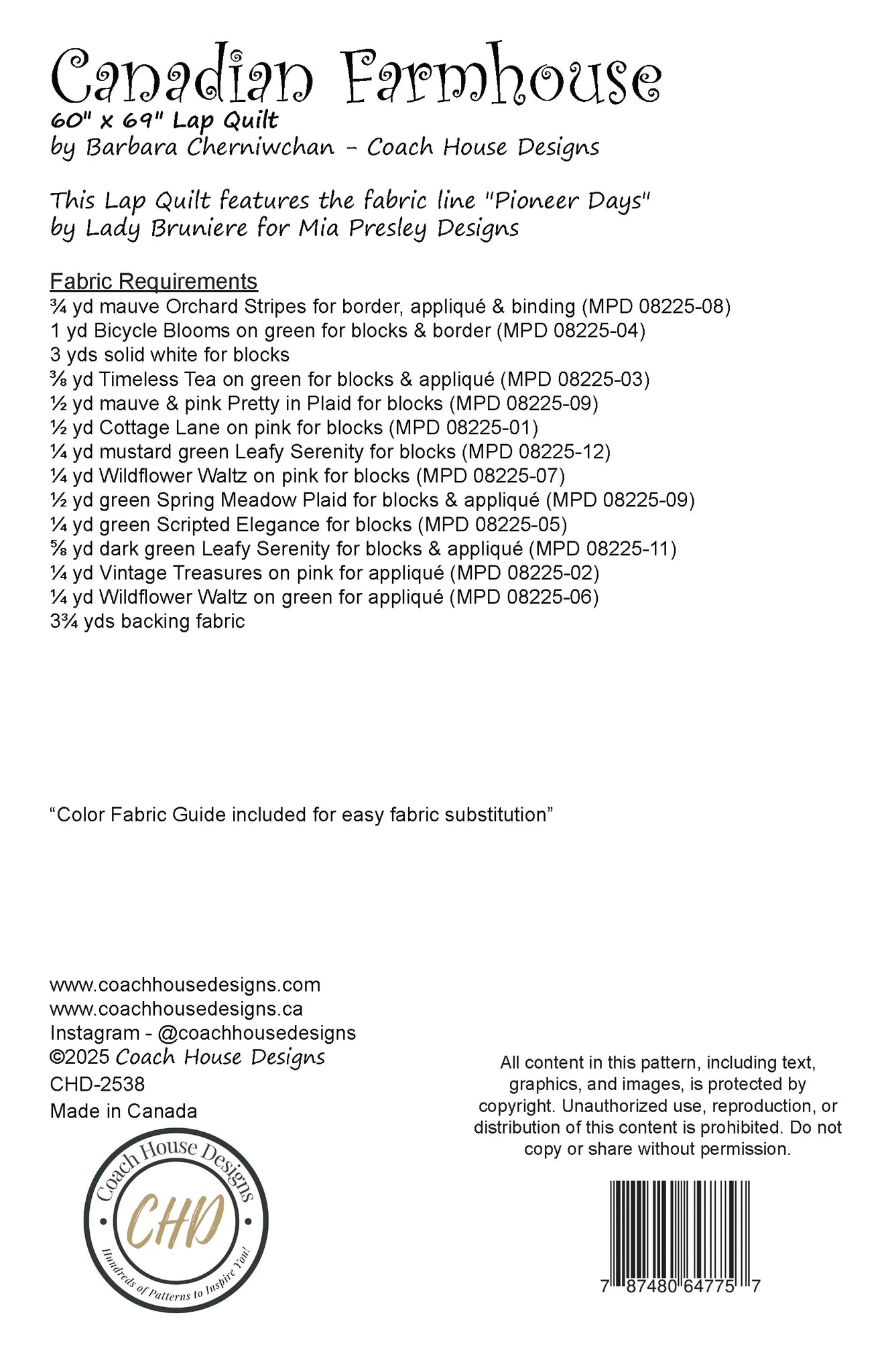 Step into a world of rustic charm and timeless elegance with the Canadian Farmhouse quilt pattern - a heartfelt tribute to the simplicity and beauty of life on the farm.  This lap quilt beautifully blends pieced and appliqué techniques, making it a delight for intermediate to advanced quilters who love storytelling through fabric.