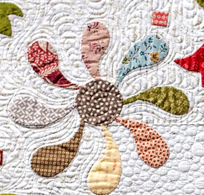 Tulipa is my interpretation of an antique quilt. It is all hand appliqued - even what looks like nine patch blocks. The stars are made using English Paper Piecing. The sawtooth border is one piece of fabric appliqued onto a background strip of fabric.