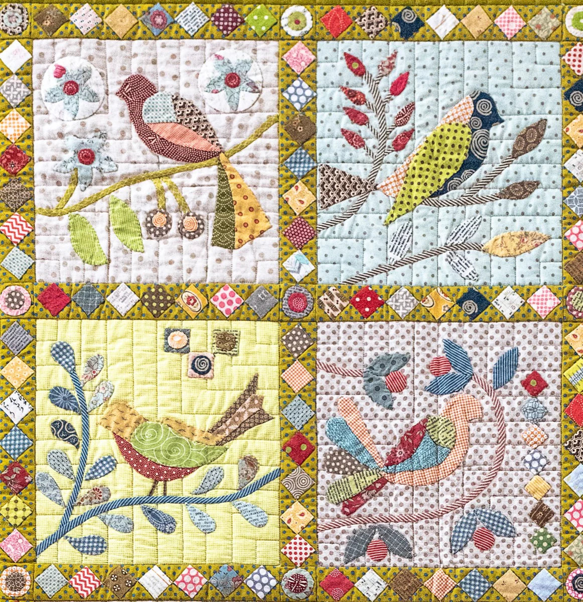 Ce quilt présente 12 blocs ornés d'oiseaux et de fleurs, encadrés de bandes de tissu. L'utilisation de carrés de 1 pouce harmonise les couleurs et permet d'utiliser ces chutes de tissu dont on ne sait jamais quoi faire.
